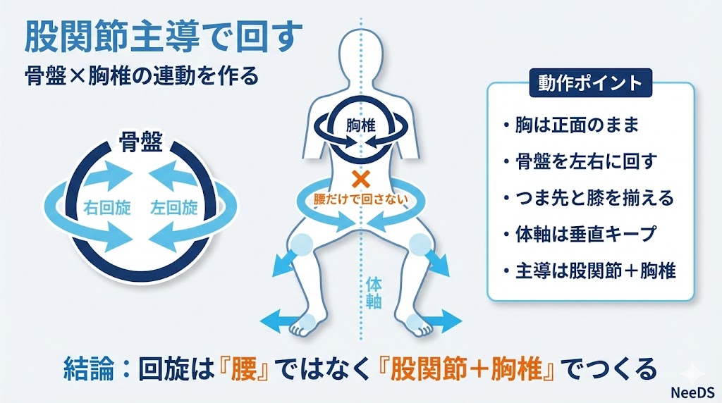 神戸・六甲道のトレーニングジムNeeDS(ニーズ)の中で「股関節セッティング」や「ローテーションドリル」と直結し、身体の回旋を安全かつ効率的に行うための基盤をつくります。