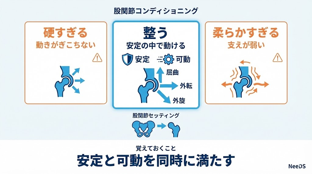 股関節が硬すぎると動きがぎこちなくなり、柔らかすぎると安定がなくなる。