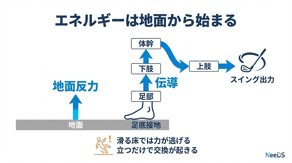 想像してみてください。氷の上やぬかるんだ地面、水中のような浮遊した状態では、どれほど体幹を鍛えても力強いスイングはできません。