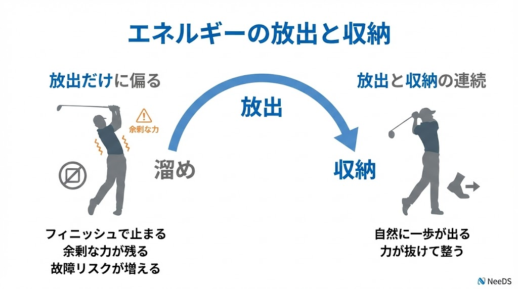 ゴルフスイングであれば、テイクバックでエネルギーを“溜め”、ダウンスイングで“放出”する。