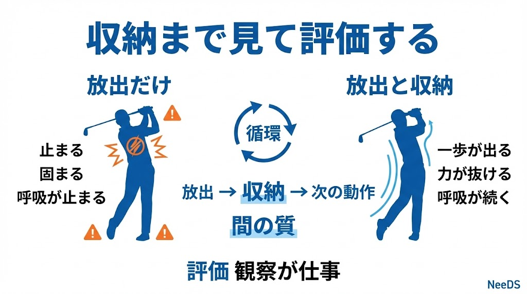 クライアントがスイング後にどう立っているか、呼吸が止まっていないか、次の動作に移るまでの“間”が自然か。