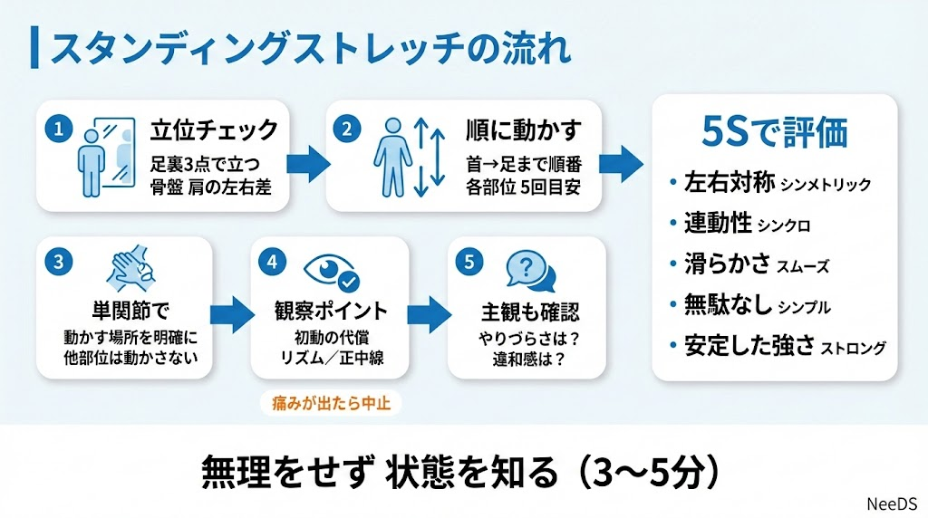 スタンディングストレッチの目的は、単に筋肉を温めることではなく「全身の連動性と感覚を取り戻すこと」。日常生活の中で固まりやすい関節をひとつずつ動かし、体のスイッチを“ON”にしていく時間です。