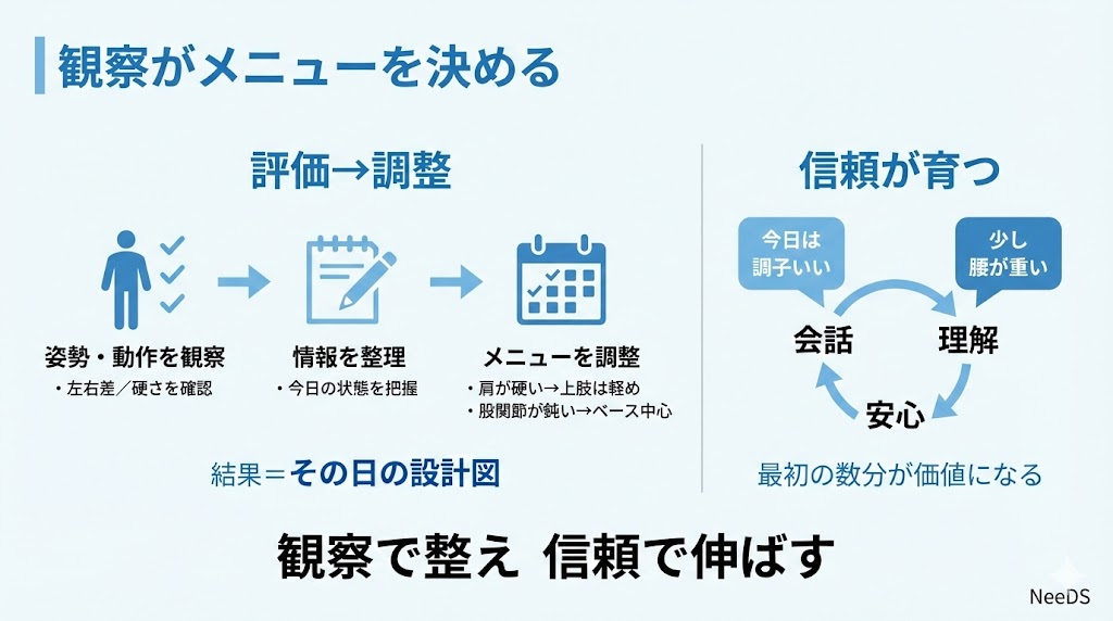 たった数分の動作の中に、相手の生活リズムや身体の変化、メンタルの状態まで見えてきます。