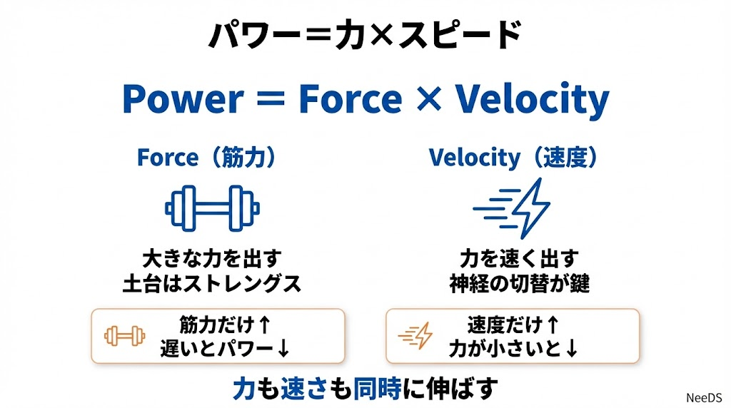 パワー=Force(筋力) × Velocity(速度)。つまり、大きな力を出せること(筋力)と、その力を素早く出せること(スピード)の2つが同時に必要です。筋力だけ高くても遅ければパワーは出ない。スピードだけ速くても力が小さければパワーは出ない。この原理を理解することが最初の一歩です。