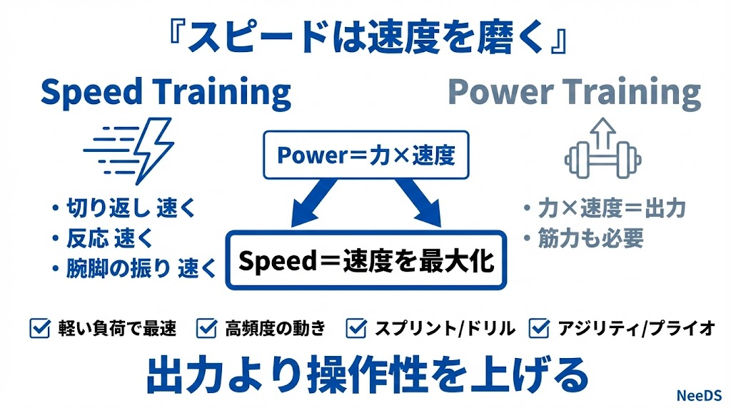 パワー=力×速度ですが、スピードは速度そのものを最大化することが目的です。つまり、パワーは“出力”の話、スピードは“操作性”の話とも言えます。