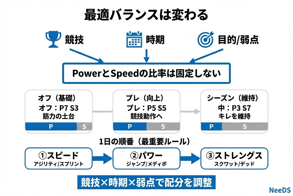 両者はどちらかだけでは最大効果を発揮できません。パワー(力 × 速度)を高めるには、筋力とスピードの両方が必要だからです。ただし「どちらを優先するか」は競技・時期・目的によって変わります。
