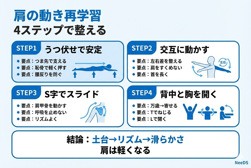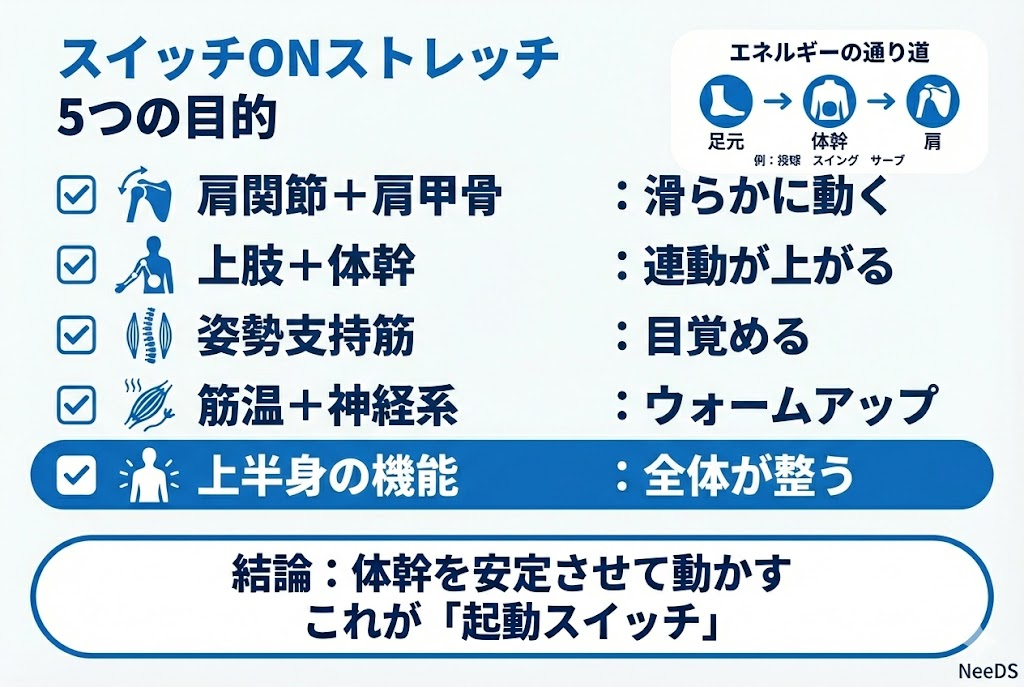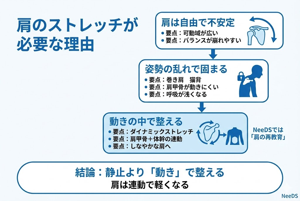 NeeDSでは、このストレッチを「肩の動きを再教育する時間」と位置づけています。