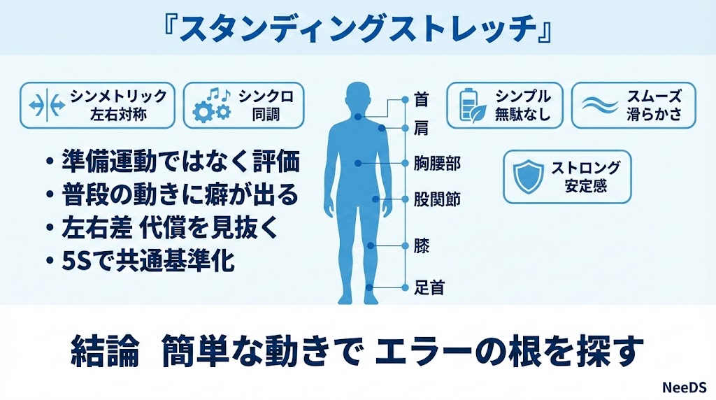 NeeDSでは、スタンディングストレッチを通して「5Sの法則」に基づいた観察を行います。