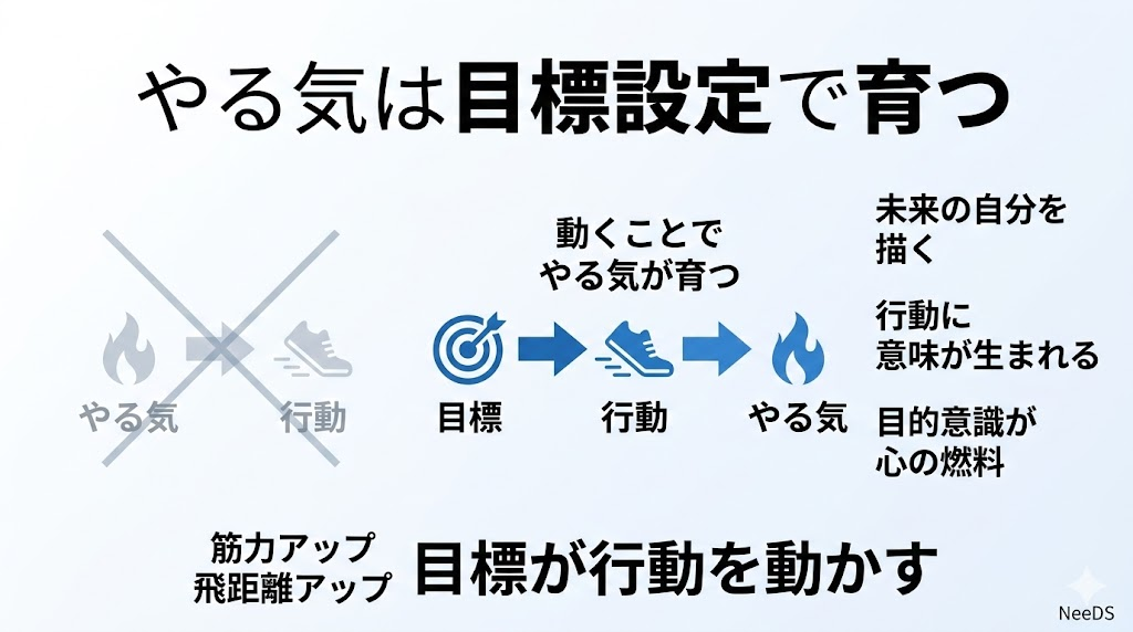 NeeDSのメンタルトレーニングでは、「目標を立て、動くことでやる気が育つ」と考えます。